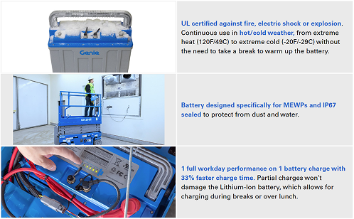 With Genie Lithium-Ion batteries, operators can work confidently, and continuously, knowing their machine can be used and charged in even the most extreme weather conditions. UL certification provides assurance that our Lithium-Ion battery solution has been successfully tested against the risk of fire, electric shock and explosion during use and transport.