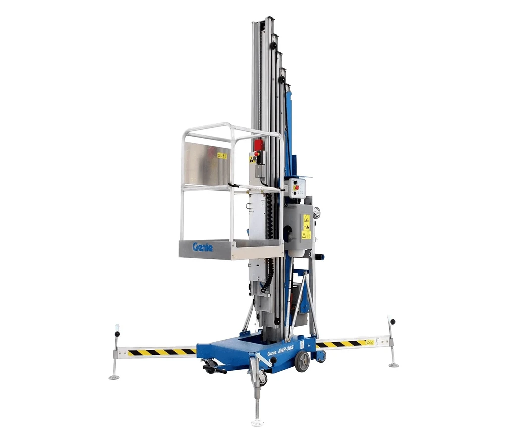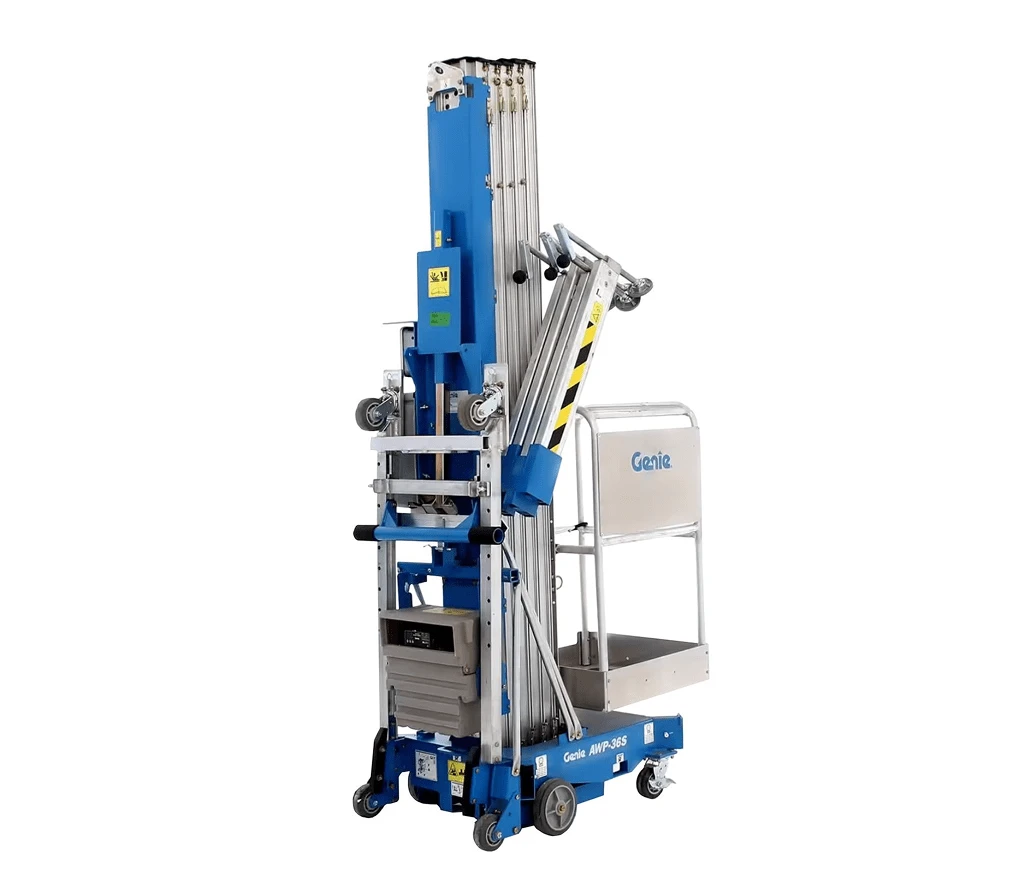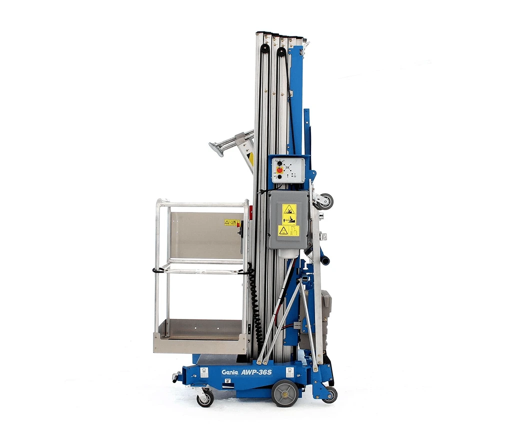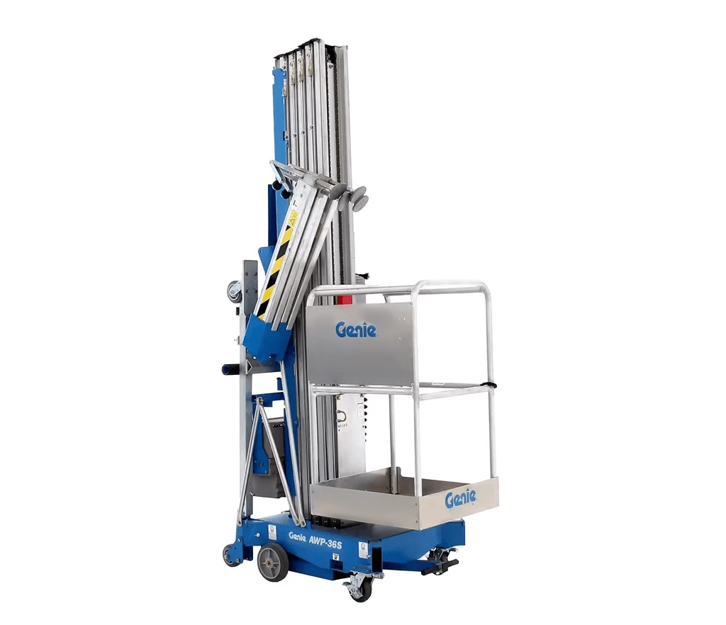The Genie AWP36S is a portable aerial work platform which is commonly used for maintenance tasks, installations and stage set ups.