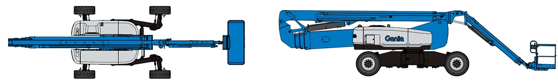 With four-wheel drive and steer, and selectable front, rear, crab, and coordinated steer modes to provide mobility on tough ground. This unmatched Genie articulating boom features proportional lift and drive controls, a parallelogram lift design, and a 272 kg platform capacity, which combine to make a machine that provides stable, safe operation at maximum reach.
