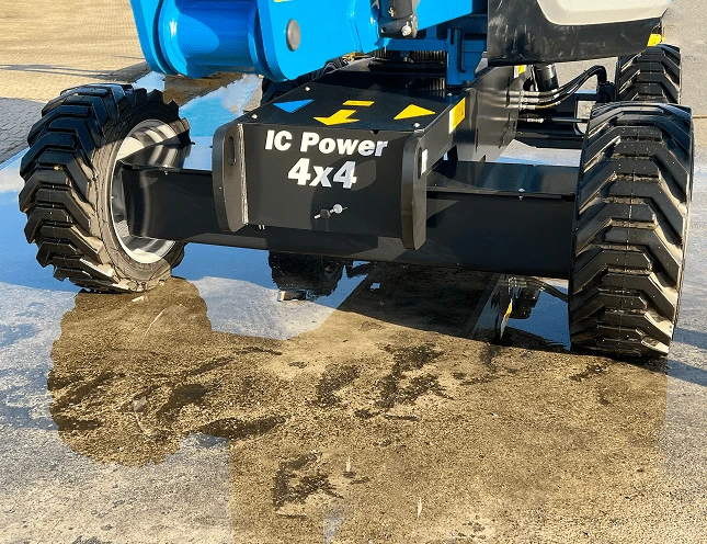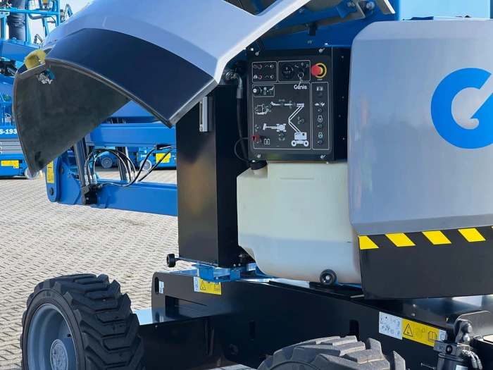 This Genie articulating boom features a tight turning radius, zero tailswing, and zero front arm swing that allows it to be operated precisely in crowded working areas. It features a full-time active oscillating axle that automatically adjusts to tough ground, 4WD traction, and 45% gradeability, which makes it a machine for rough terrain and sloping ground surfaces.