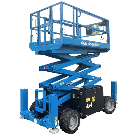 In summary, the Genie GS-2669 RT is a rugged, heavy-capacity rough terrain lift that excels in outdoor use, with robust 4WD drive, large platform area, and smart functionality — all designed to deliver maximum uptime, safety, and efficiency on demanding worksites.