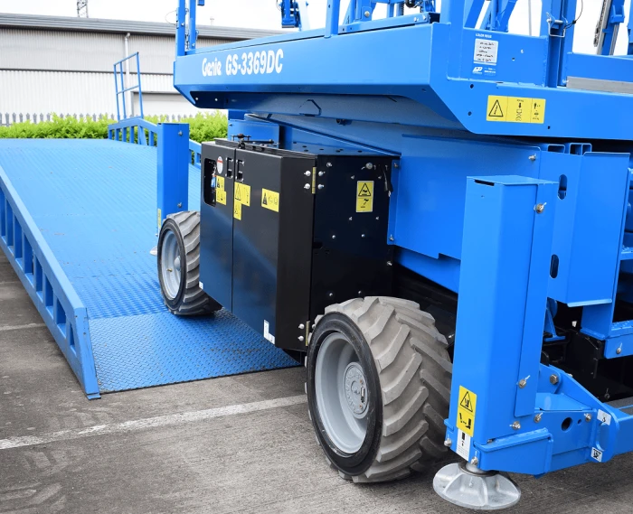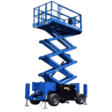 The Genie GS-3369 DC rough terrain scissor lift has a load capacity of up to 454kg (136Kg with extension deck extended).