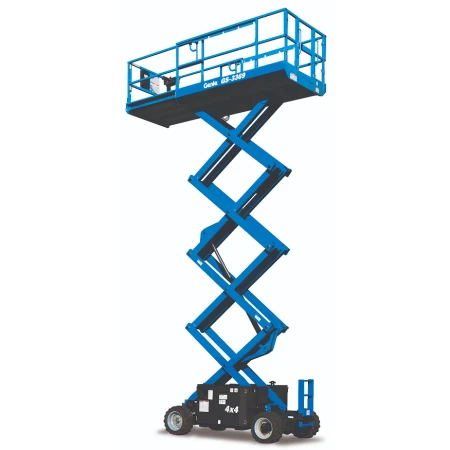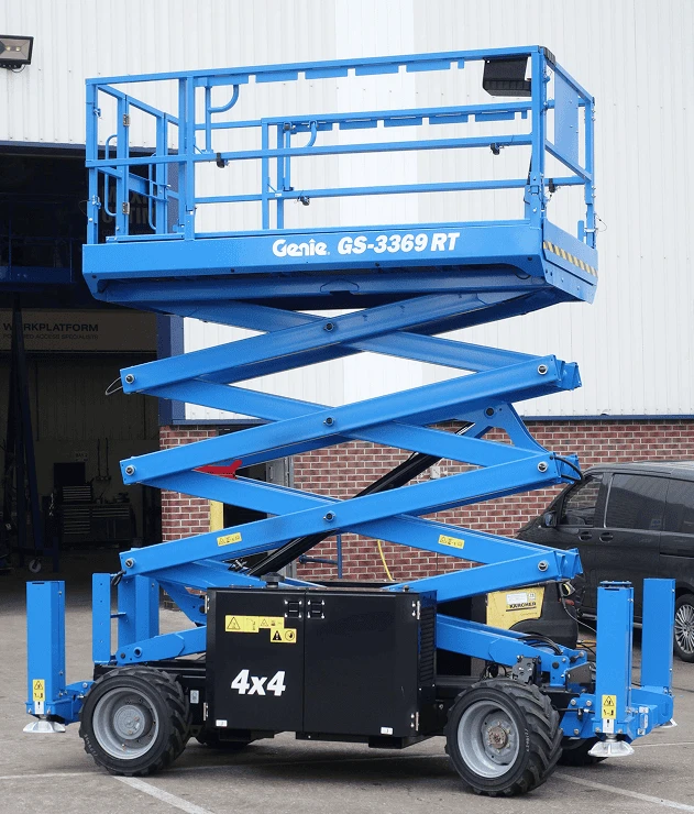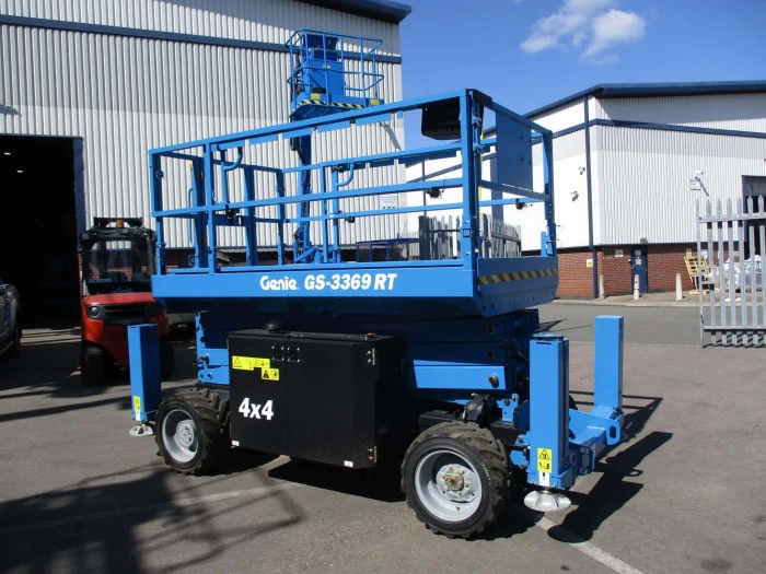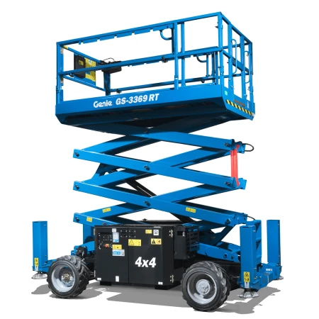 Genie GS-3369 RT rough terrain scissor lift is a heavy-duty, diesel-powered machine that's built to handle tough outdoor environments and rough terrain. With 11.96m maximum working and drive height, with a 454kg lifting capacity, it offers outstanding productivity on uneven surfaces. Its robust, heavy-duty design makes it an industry-leading solution for working at height for construction projects, installation tasks, inspection work, and maintenance work.