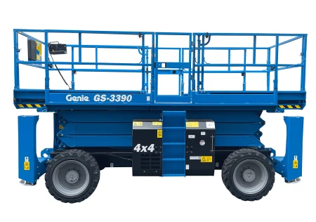 The Genie GS-3390 RT is a diesel-powered rough terrain scissor lift with an exceptional lifting capacity, designed to operate at its best on the toughest outdoor job sites. At 12.06 meters of working height, the lift is ideal for installation, maintenance, inspection, and construction work that requires multiple workers.
