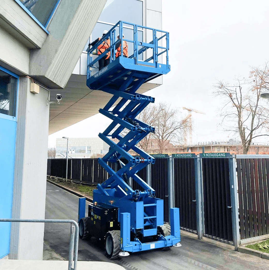 This electric rough terrain scissor is built to handle slopes, ramps, and uneven terrain with ease.