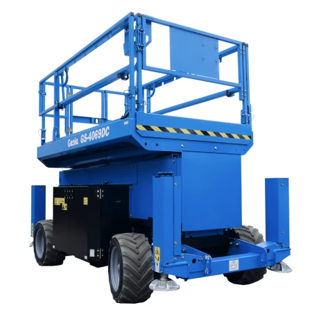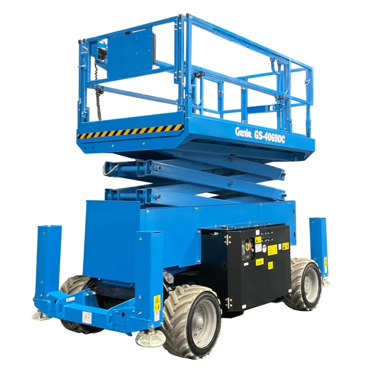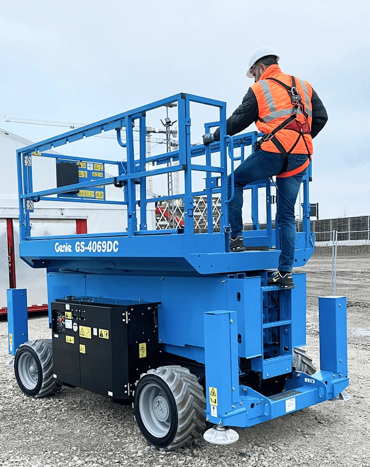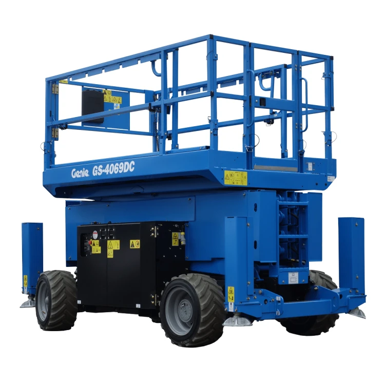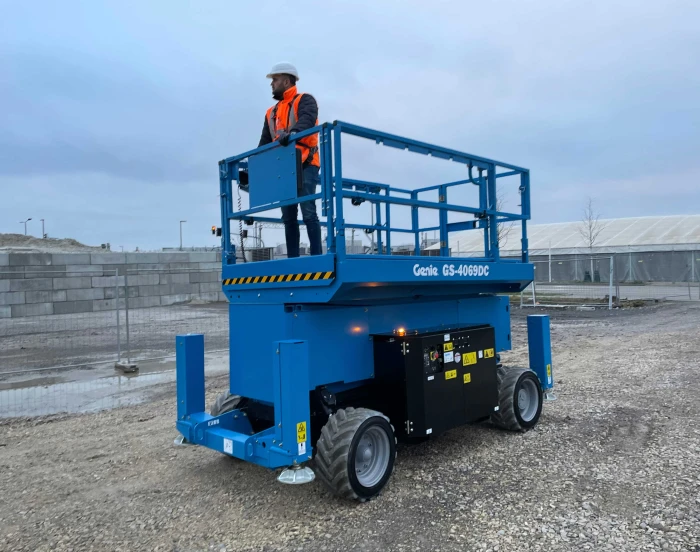 The Genie GS-4069 DC rough terrain scissor lift has a load capacity of up to 363kg (136Kg with extension deck extended).