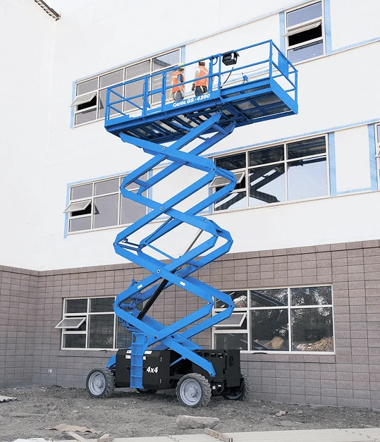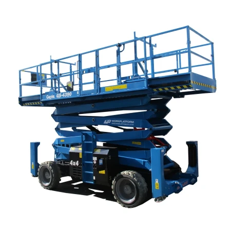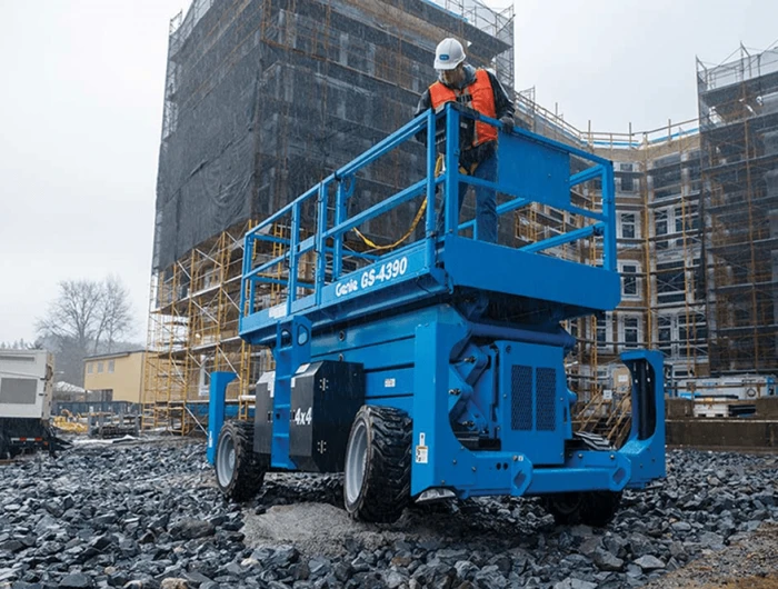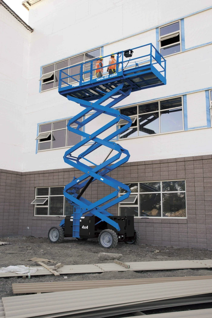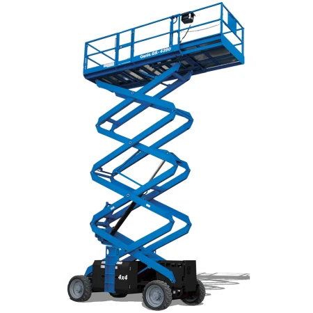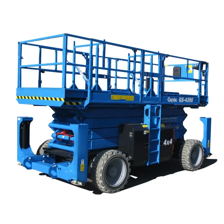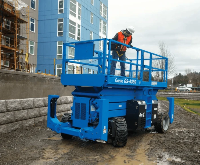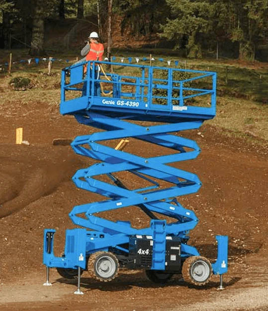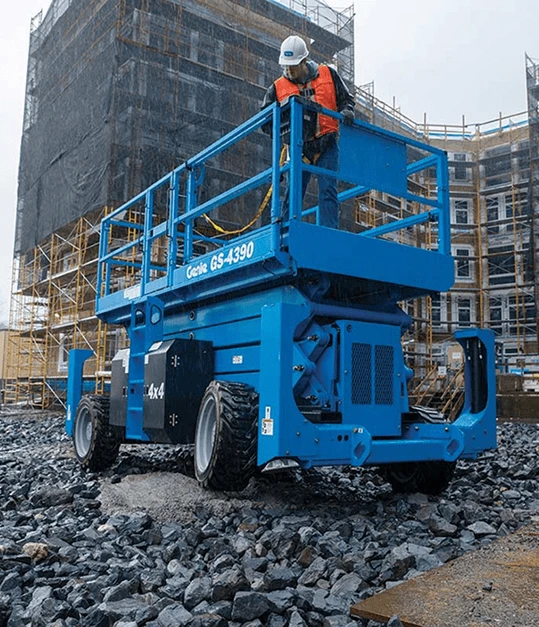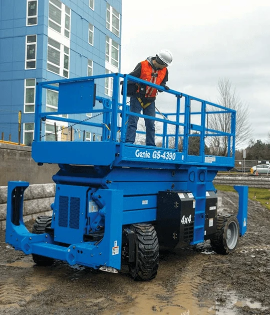 The Genie GS-4390 RT is a rugged and versatile diesel-powered rough terrain scissor lift designed to meet the challenges of demanding outdoor job sites.