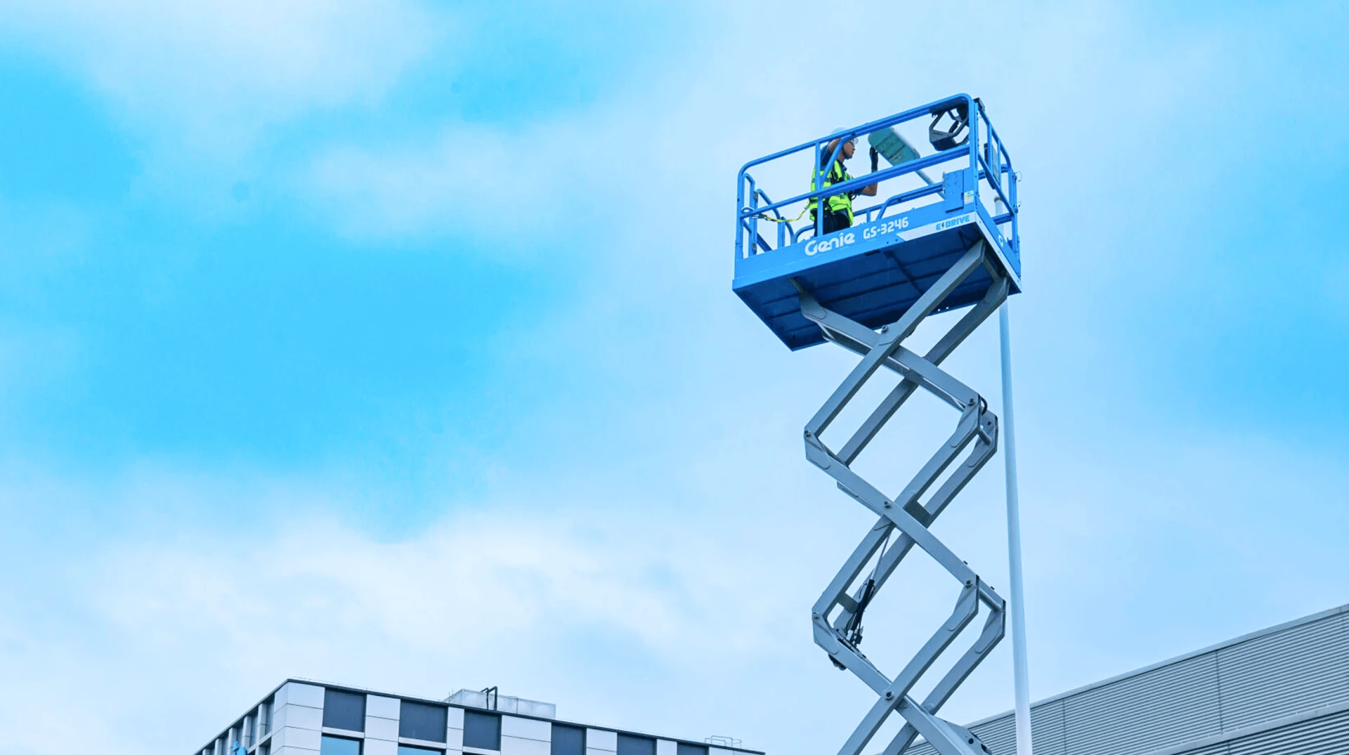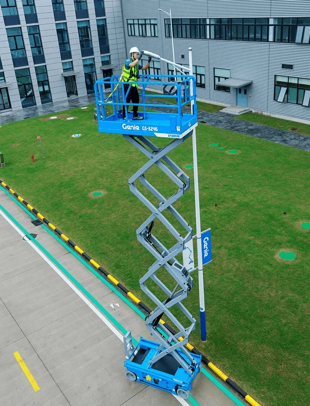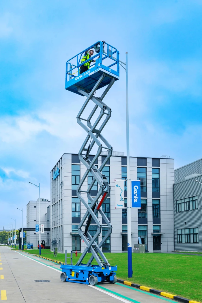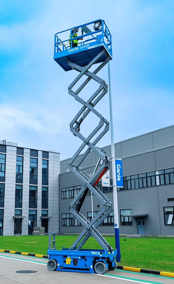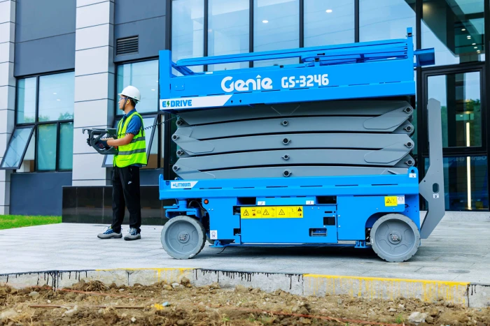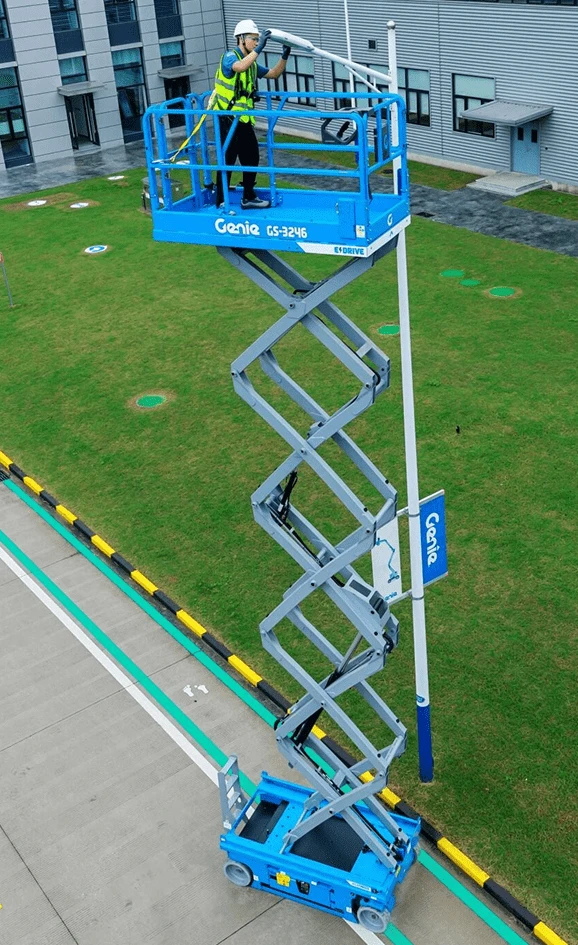 The Genie GS3246 electric scissor lift delivers unmatched driving performance and industry-leading runtime per battery charge.