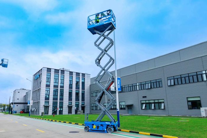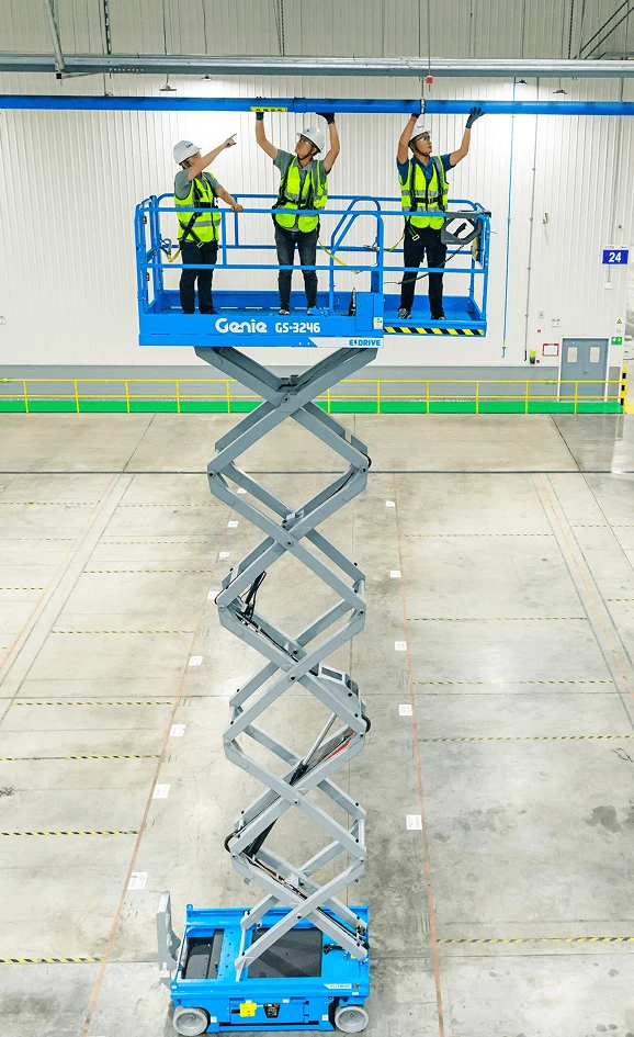 The GS3246 scissor lifting can occupy up to three people inside and only one person when operated outdoors.