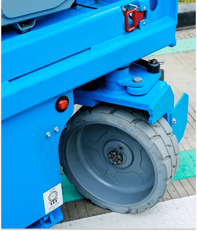 Genie's AC electric E-Drive technology provides increased efficiency and longer battery life to support productivity on work sites with great mobility. AC electric drive motors deliver increased performance in driving, while 25% gradeability and 14° breakover angle of the machine facilitate easy climbing up and down ramps and slopes.