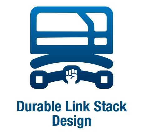 Curved scissor pack provides strength and rigidity and allows the links to fold closer together. Its rigidity reduces platform bounce and offers smooth raising and lowering. The curved scissor stack design allows water to drain easily, helping to prevent pooling and reduce the risk of rust or corrosion over time.