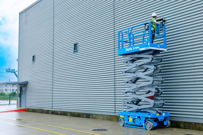 The scissor lift's electric drive system enables quiet and clean operation, producing no emissions, making the GS-4046 suitable for indoor use in sensitive areas such as hospitals, schools, and office buildings. With its narrow width, the GS-4046 can fit through standard double doorways with the rails folded.