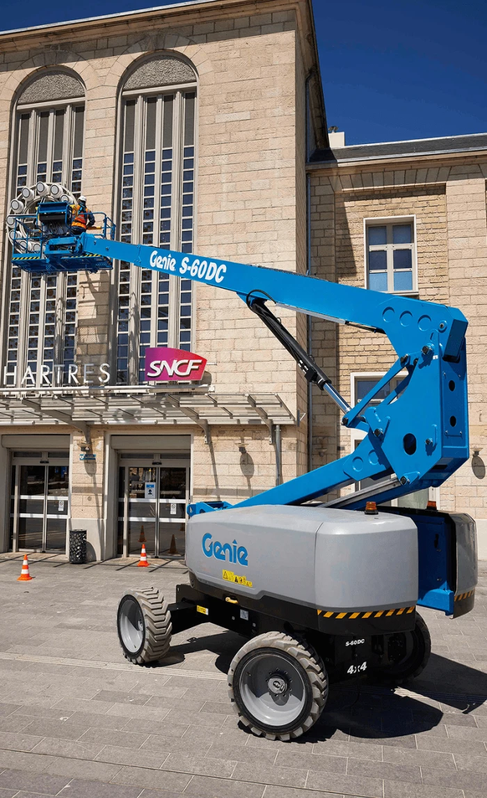 The Genie S-60 DC is a telescopic boom lift that combines the performance of a 4x4 diesel boom with the benefits of a clean all-electric system. Ideal for numerous indoor and outdoor applications, this all-electric boom lift offers great performance with zero emissions, making it ideal for construction sites, sports arenas, malls, facilities, and pedestrian areas. With ultra-efficient AC drive motors, the Genie S-60 DC provides a full day's work on one charge of the batteries, for high productivity and low downtime.