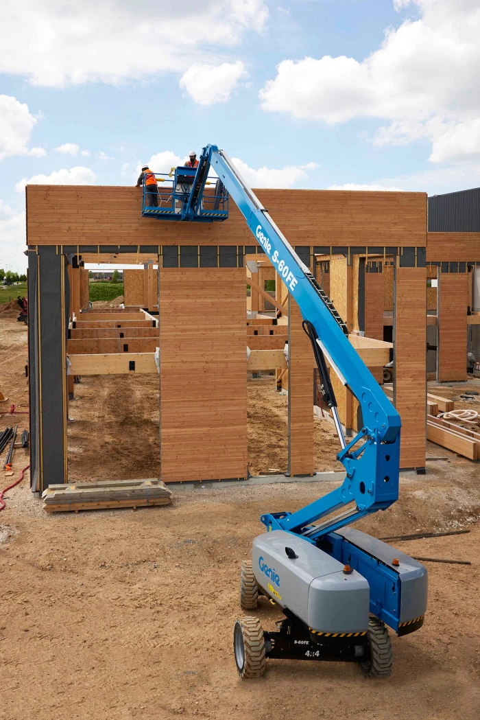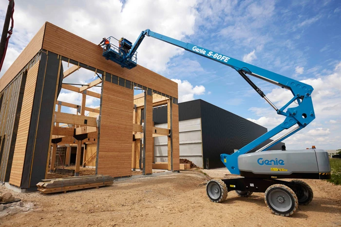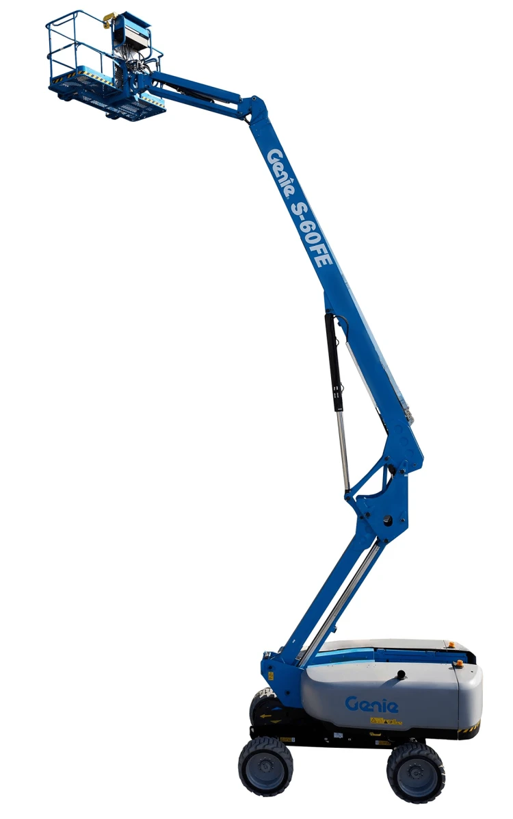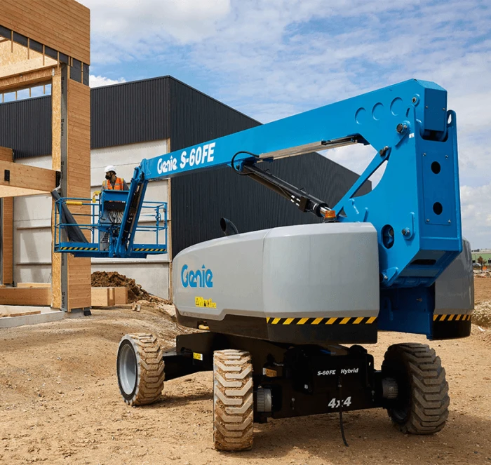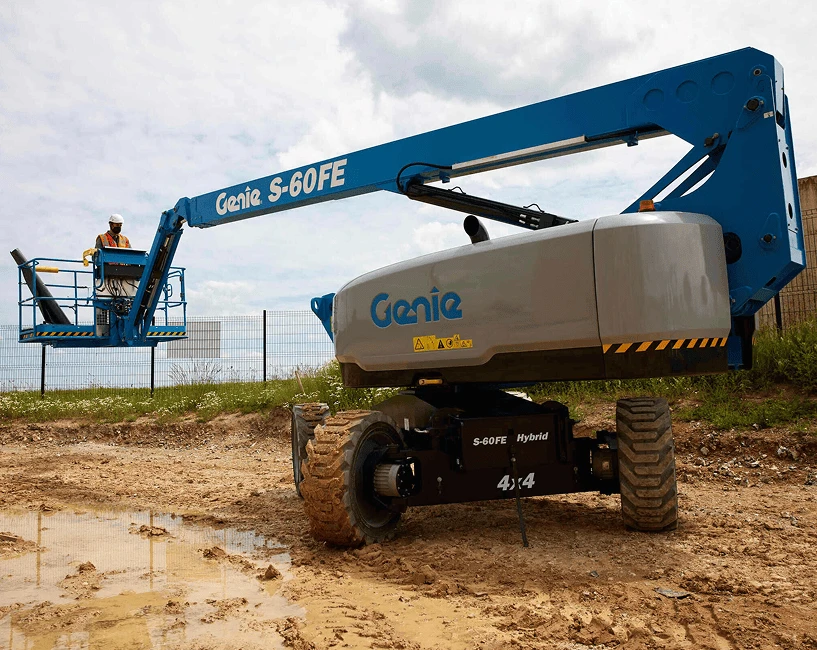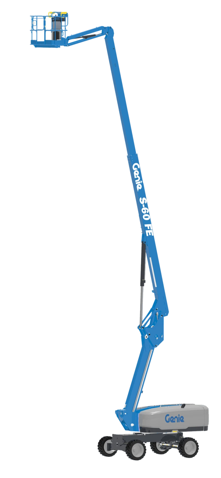 The Genie S-60 FE hybrid boom lift delivers rough terrain capabilities with clean and quiet jobsite performance.