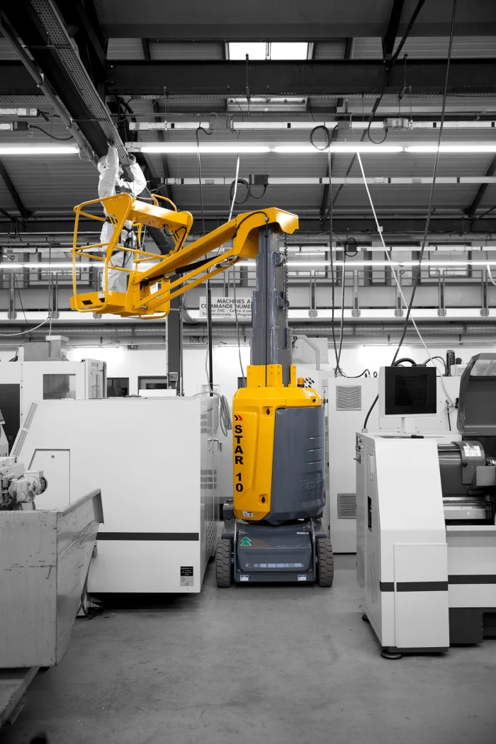 The compact design and responsive handling make the Haulotte Star 10 easy to navigate through tight indoor spaces and congested job sites.