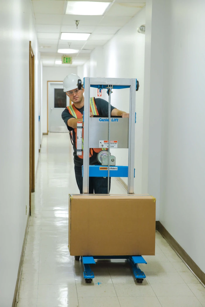 Offering a compact footprint and an excellent load capacity, the Genie GL4 material lift is commonly used for moving heavy materials to or from shelves, installing and repairing jobs, and transporting heavy components around a workspace, as well as other manufacturing applications.