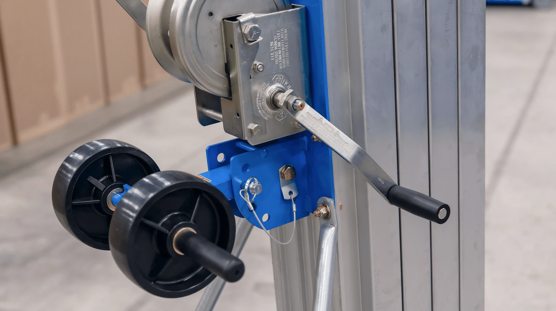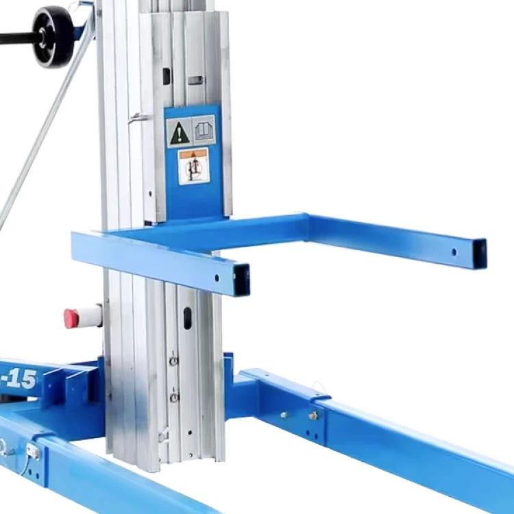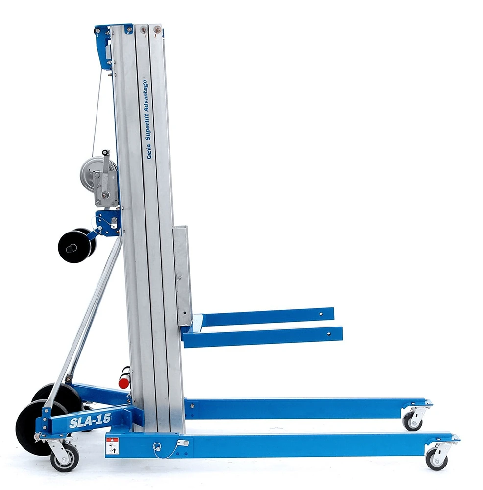 The Genie SLA material lift features a patented telescoping mast system and a one-speed manual winch that locks the load in place.