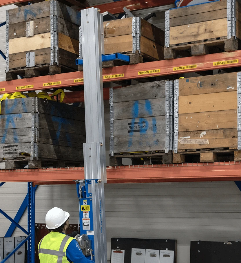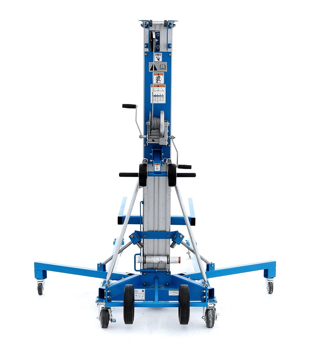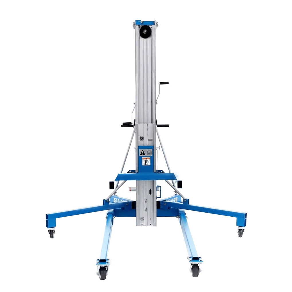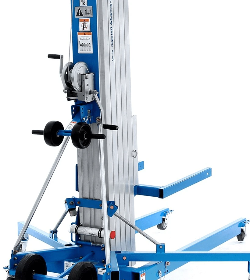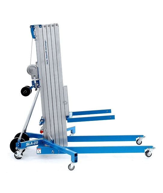 The Genie SLA material lift features a patented telescoping mast system and a one-speed manual winch that locks the load in place.
